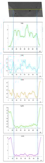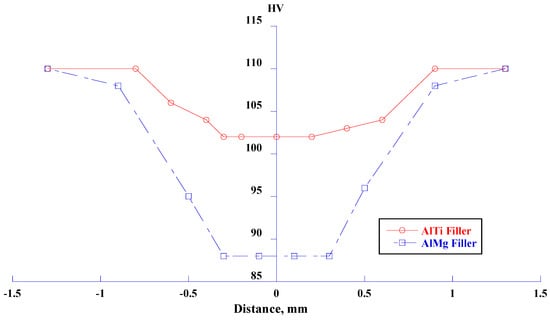 The microhardness profile of the welded joint is presented in Figure 9. The hardness profile shows that the welded joint is mechanically and compositionally heterogeneous, which makes the fusion zone the weakest part of the welded structure. It can be seen that the hardness decreases gradually from a maximum value in the zone of the base metal to a minimum value in the weld zone. The lower hardness in the weld zone was due to the evaporation of strengthening elements, thereby preventing the formation of strengthening precipitates [21]. However, the refinement of grains in the weld zone with Al-5Ti-B explains the higher hardness in the joint relative to the joint with Al-5Mg. The mean hardness in the weld zone with Al-5Ti-B and Al-5Mg filler metal is 102 HV and 88 HV, respectively. Table 2 presents the result of the tensile tests of the specimens. The welded joint with Al-5Ti-B has a yield strength and ultimate tensile strength of 88% and 97% of the value of the base metal respectively, and the welded joint with Al-5Mg filler metal has yield strength and ultimate tensile strength of 68% and 67% of the base metal, respectively.