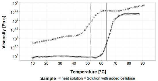 All tested solutions clearly undergo a rapid sol gel transition as expressed by a 10–100-fold, rapid increase in shear viscosity (Figure 1). Adding cellulose increases the viscosity of the solution and lowers the gel point from 63 °C to 52 °C. After gelling, a minor increase in viscosity can be observed.