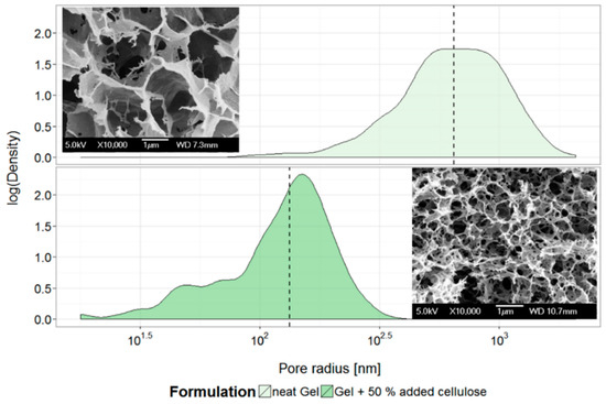 SEM micrographs and distribution of the measured internal pore radius of freeze-dried gel samples. Shown are the neat gel and the gel with 50% added cellulose powder. The lines represent the median value of the distribution. The addition of cellulose causes an almost 10-fold reduction in internal pore radius.
