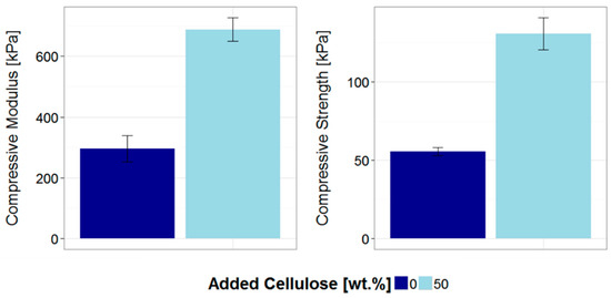 The addition of cellulose could also be shown to have a strong effect on the mechanical properties of the produced gels. The added cellulose increase both, compressive modulus and strength by a factor of 2.3 (Figure 3).