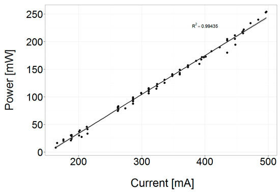 The relationship between current input and power output from the laser diode is clearly linear all across the area of interest (Figure 5).