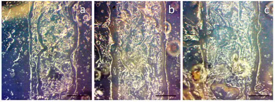 Optical photographs of a sample showing the printed, rectangular strips. The strips were printed, from left to right, using a low (a), medium (b) and high (c) power setting. The scale bar represents 500 µm in all three images.
