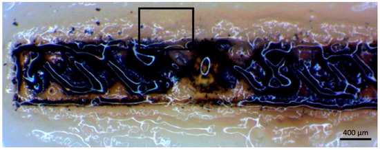 When using the higher power setting, spontaneous burning of the solution can occur, and the printed path maybe wider than designed as shown in Figure 7.