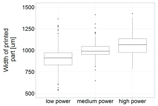 To check the printing quality, the width of the printed part was measured, using optical images (Figure 8). Confirming the initial observations, the lowest power setting results in a printed path that is narrower than the designed 1 mm with a median of 909 µm and an interquartile range (IQR) of 828–970 µm. Additionally, of the variations in measured values, 599 µm is the highest of all three tested settings. On the other hand, the high-power setting results in a median part width of 1064 µm and thus, is larger than the designed 1 mm, as well it showed similarly high variation of 564 µm, as the low power setting. The IQR at the high-power setting (161 µm) is also the highest of all three settings, compared to the low (143 µm) and medium power setting (93 µm). At the medium power setting, the parts show a very close match to the designed width with a median of 989 µm, and also a strongly reduced variation of 345 µm.