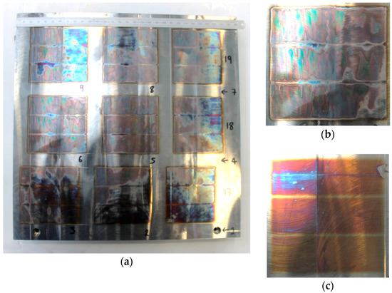 Immediately before irradiation, the samples were carefully degreased using isopropanol and left to dry in air. Nine square (75 mm side length) areas were identified and irradiated in three passes following the order in Figure 1; between each area irradiation, there was a waiting time of 30 s to allow for the cooling of the metal piece. Exposure of the machined coupons to the laser beam was performed following a design of experiments approach aiming to investigate the combination of parameters that did not result in the melting of the surface. The design of experiment laser parameters are presented in Table 3. Care was taken to allow the plate to return to room temperature after each set of exposure (9 areas) before turning the plate for the next lot of exposures. Immediately after irradiation, photographic evidence of the sample was recorded (Figure 1). Figure 1b shows the surface of the sample with a widespread surface melting (LE150), while Figure 1c shows one with incipient surface melting (LE7.5).