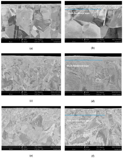Moreover, as shown in Figure 3e,f, the surface layer in the surface-melted specimens appeared to be significantly coarser and did not show the ultrafine grain structure visible in the specimens that did not undergo surface melting. Conversely, when no melting occurred, the machining-induced layer was preserved (Figure 3b,c).