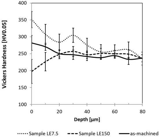 Cross-section micro-hardness measurements were carried out on the as-machined samples, i.e., prior to irradiation, as well as after irradiation on a sample that underwent surface melting (sample LE150) and the one that did not undergo surface melting (sample LE7.5). The results, which are reported in Figure 4, show that in the as-machined sample, there was a surface hardness increase up to ~280 HV within the first 20 µm beneath the surface. The hardness then dropped to the baseline hardness of ~240 HV; these findings are consistent with the cross-sectional characterization and the presence of a surface work-hardened layer. However, upon laser irradiation under conditions that did not induce surface melting (Sample LE7.5), the work-hardened surface layer increased its hardness, which peaked to about 350 HV at the surface, linearly dropped to around 300 HV at a depth of 20 µm, and then remained somewhat constant at 250 HV until the maximum measured depth of 80 µm. Conversely, the sample that was irradiated with a higher value of LE (Sample LE150) presented an opposite trend. Specifically, there was a surface softening, and the hardness had a minimum of 200 HV at the surface, before increasing to around 250 HV at a depth of 30 µm and then remaining constant until a depth of 80 µm at around 250 HV. These results showed that surface melting significantly reduced the surface hardness, whilst the not-melting laser heating treatment significantly increased it. In Figure 4, it is shown that the measured hardness profiles of all samples remained statistically distinct up to a depth of 50 µm below the surface.