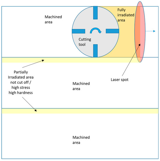 When irradiating the surface of a machining sample with a traveling laser beam, the energy is partially absorbed by the metal and results in a rapid heating of a relatively thin layer of material; afterwards, a rapid cooling occurs by heat conduction to the cold substrate, which acts as a thermal sink. Therefore, the distance between the laser spot and the machining feed must be calibrated accurately if cutting is to occur at the correct temperature. Moreover, laser spot power density distribution inhomogeneity requires an area slightly larger than the cutting tool to be irradiated. When using a rectangular-shaped spot, a top-hat distribution in the transverse direction and a Gaussian in the scan direction, represent the most favorable distributions. It is, however, difficult to obtain very steep slopes in the top-hat distribution, hence the need for the exposure of an area larger than the portion that will undergo machining. This results in partially or fully irradiated areas that are not being removed by the subsequent machining and can lead to the generation of tensile surface stress [26,27,28]. In LAM, the laser beam is placed slightly ahead of the machining tool, and machining happens immediately following irradiation. However, overlapping machining tracks result in scattered areas of pre-heated material, which are not being removed [29]; for parallel machining tracks, this effect is particularly strong with dis-homogeneities in the transverse direction and can result in undesired areas of increased residual surface tensile stress [30,31].
