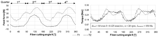 The feed force and torque of the drilling tests with different rake angles are compared with each other in Figure 2. Due to the different tool geometries it can be determined that different characteristics occur and that the fiber orientation has a strong influence on the progression of the tool loads.
