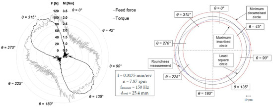 Figure 3 shows the force and torque over one revolution during drilling with tool T3. The variabilities in the cutting force also result in roundness (cf. Figure 3, right) and surface errors. All cutting and geometrical parameters of tool T2 with Ø10 mm have been scaled on Ø25.4 mm to make the machining operations comparable. Due to the angles of the cutting part, just peel-up delamination occurs using tool T2 and T3. The push-out delamination is negligible when applying these tools.