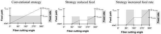 This new approach should discharge the delamination-critical area of 0° ≤ θ ≤ 90° and enhance the surface and machining quality. With the strategy reduced feed (cf. Figure 4, middle) the resulting feed of one revolution is equal to half of the feed using the conventional strategy. An adjustment to the same primary processing time is possible. Twice conventional feed must be used (cf. Figure 4, right).