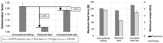 Figure 5 represents the results of the application of the new strategy in an experimental test series compared to the conventional drilling strategy. As a result of the new strategy, the delamination factor at the bore entrance according to Chen can be significantly reduced using the feed rate of the conventional process (cf. Figure 5, left). The reduction of primary process time by increasing the cutting speed should be checked separately. Adjusting the feed to achieve the same primary processing time as in the conventional process causes larger delamination than the previously described strategy. An improvement in roundness could not be determined.