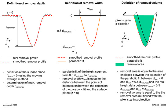 Afterwards, the height data covering the range between 0.5 drem,max and drem,max were extracted and underwent a parabolic fit. The distance between the intersection points of the extension of this parabolic fit and the zero-line determined the removal width wrem that was considered for later correlations. Finally, the removal area was defined to comprise the area of the real removal data enclosed between 0.5 drem,max and drem,max, as well as the area enclosed by the parabolic fit at the height range between 0 and 0.5 drem,max. To define the removal volume within one pixel, the determined removal area (for one 2D profile) was multiplied by the pixel size in the x-direction (0.278 µm), whereby a constant removal along one pixel was assumed. This procedure was performed for all 2D profiles along the x-axis in a for-loop. Hence, the average geometrical values and the standard deviations of complete images were calculated and summarized in excel files.
