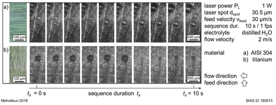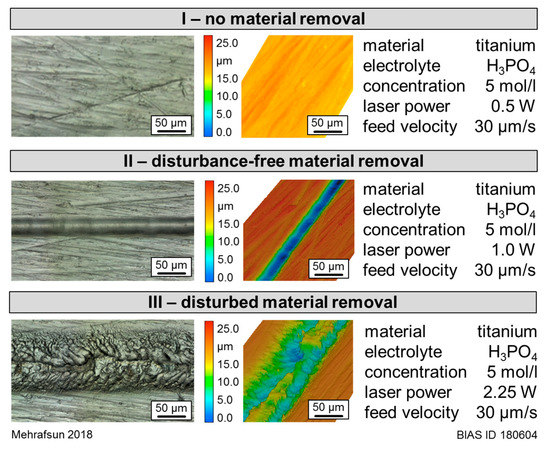 In general, the induced temperature distribution as a consequence of the applied laser powers determines the interaction area and thereby the removal width. In contrast, the removal evolution into the material, represented by the removal depth, is mainly determined by the feed velocity. However, the process window for a disturbance-free removal becomes larger with increased concentration. This is related to the electrolyte viscosity, which increases with the concentration and results in the formation of smaller gas bubbles [29]. The smaller the gas bubbles are, the longer they need to agglomerate to a bigger one. This could explain the shift of gas bubble adherence to higher laser powers. However, this is still to be investigated more in detail, especially when considering the influence of the electrolyte streaming, such as the flow direction and rate.