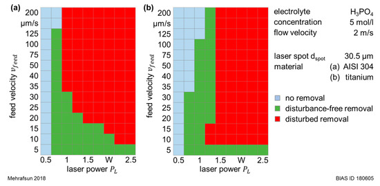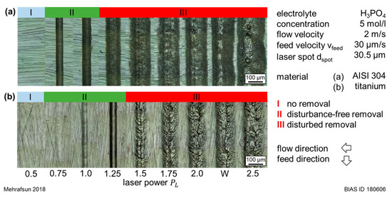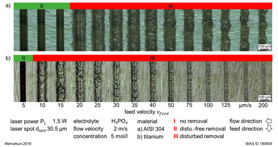 As seen in Figure 4, a laser chemical removal was observed in both materials starting at PL = 0.75 W. At this laser power, a disturbance-free material removal was obtained up to a feed velocity vfeed of 125 µm/s in stainless steel and up to 30 µm/s in titanium. A further increase of laser power PL resulted in different behaviors for the two materials. In stainless steel, the range of velocities for a disturbance-free removal decreased continuously with the increasing laser power. In contrast, in titanium, a bell-shaped removal profile was also obtained at higher feed velocities at 1 W (up to vfeed = 100 µm/s) and 1.25 W (up to vfeed = 200 µm/s). For a laser power PL ≥1.5 W, removal disturbances were observed for most combinations, except with a feed velocity of 5 µm/s.