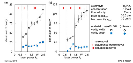 Figure 5 shows the resulting cavities in dependence on the applied laser power during the LCM of stainless steel (Figure 5a) and titanium (Figure 5b) exemplarily with a feed velocity of 30 µm/s. It can be observed that the cavities were more pronounced in stainless steel than in titanium.