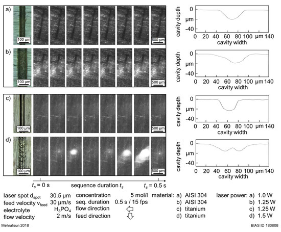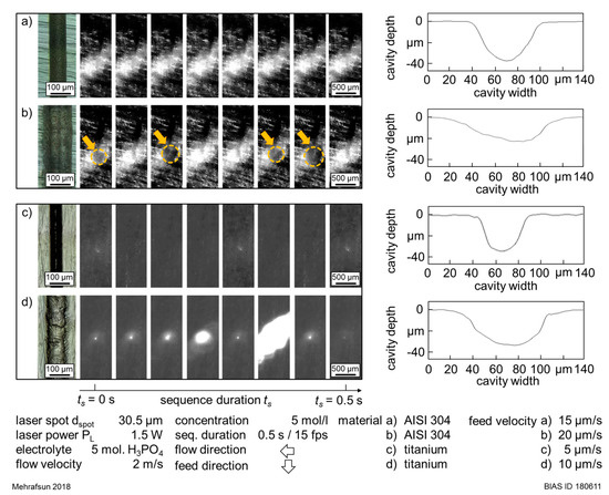 Moreover, CCD records of the interaction zone in both materials were analyzed at the transition from a disturbance-free to a disturbed material removal with increased feed velocity vfeed. As seen in Figure 10, the transition to a disturbed removal was characterized by a change of the removal profile from a bell-like one to a widened and flattened profile in both materials. Similar to the observations in Section 3.1.2, the transition to the disturbed removal regime was accompanied by fluctuating light reflections, which were related to the presence of gas bubbles. It has to be noticed that two different behaviors were observed. Figure 10d shows that the gas bubble activity in titanium was intense and the adherence of gas bubbles was nearly permanent. Thus, strong and fluctuating light reflections were observed. In contrast, Figure 10b shows a lower gas bubble activity in stainless steel. Moreover, the presence of a growing single gas bubble was observed, as marked in orange in Figure 10b. The growth of this gas bubble could be related to its ascent phase from the interaction zone.
