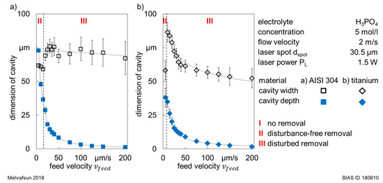 Figure 8 shows exemplarily the resulting LCM cavities realized in titanium and stainless steel in dependence of the feed velocity vfeed at PL = 1.5 W. At this laser power, the removal remained nearly disturbance-free at low feed velocities, despite an assumed high thermal impact. However, the removal quality diminished with the increasing feed velocity. The transition from a disturbance-free (green marks) to a disturbed removal (red marks) took place by increasing the feed velocity from 15 µm/s to 20 µm/s in stainless steel, while it occurred at vfeed = 10 µm/s in titanium.
