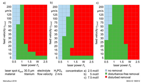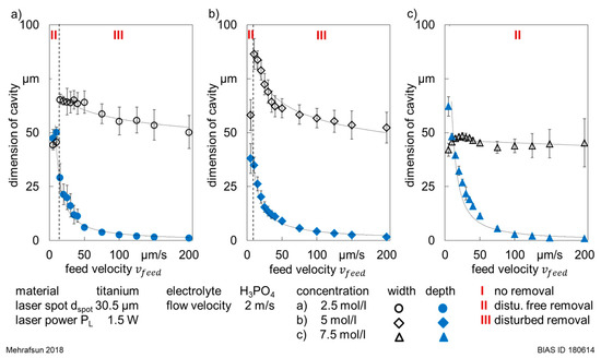 Figure 11 shows the experimentally determined LCM removal regimes resulting from the machining of titanium in phosphoric acid solutions with different concentrations of 2.5, 5 and 7.5 mol/L in dependence of laser power PL and feed velocity vfeed. Following the definition that a disturbance-free machining was characterized by a bell-like removal profile, it can be stated that the corresponding process window was the largest with an electrolyte concentration of 7.5 mol/L (see Figure 11c). Here, the disturbance-free removal was achieved, with few exceptions, with laser powers between 0.5 W and 1.5 W. In comparison, with the concentrations of 2.5 mol/L (Figure 11a) and 5 mol/L (Figure 11b), a disturbance-free removal was mainly achieved with laser powers PL between 0.75 W and 1.25 W. However, as already shown in Section 3.1.3, the removal tended to diminish or to get disturbed with an increasing feed velocity vfeed.