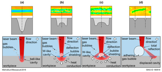 Hence, the CCD records provided an experimental evidence of the involvement of adhering gas bubbles, caused by thermochemical reactions and electrolyte boiling, in the occurrence of material removal disturbances. In Figure 15, some typically obtained removal geometries were depicted. In addition, schematic illustrations of the supposed mechanisms explaining their occurrence were given. For the disturbance-free regime (Figure 15a), reaction-related gas bubbles were supposed to be the dominant bubble type during the LCM process. Due to their small size (sub-micron range), these gas bubbles had no significant influence on the incident laser irradiation and thereby on the removal. The phenomenon above is in accordance with other electrochemical processes, in which reaction-gas bubbles (hydrogen formation) do not affect the removal quality at suitable parameter combinations [20]. Once a gas bubble with a size of some 10 µm is adhering to the interaction zone, the incident laser beam will be significantly affected. The formation of these bubbles could be related to electrolyte boiling due to high heat impact at the workpiece surface [17] or to the agglomeration of smaller bubbles during their scent at certain conditions, depending on the density and the viscosity of the electrolyte and on the surface tension [21]. The influence on the resulting removal geometry in dependence of the bubble size is shown in Figure 15b,c. If the diameter of the adhering gas bubble was similar to the laser spot diameter at the workpiece surface (Figure 15b), it could be assumed that the gas bubble shielded the workpiece surface against the electrolyte, resulting in a reduced material dissolution reaction [16]. As demonstrated in [18], this was due to deposited metallic salts and oxides that could not be transferred out of the cavity. However, the thermal impact due to the laser–workpiece interaction resulted in a lateral heat conduction towards the periphery, which explained partially the W-like removal profile. In contrast, if the gas bubble diameter was larger than the laser spot (Figure 15c), light deflection was supposed to be more significant. The adhering bubble could act like a scattering center and deflect a part of the incoming laser beam to its periphery (the light deflection effect) [22]. In combination with the heat conduction, this could explain the significant broadening in removal cavity observed during the disturbed regime. Another possible removal geometry is shown in Figure 15d. The removal revealed a periodic behavior consisting of cavities that were formed in the increasing angle with respect to the feed direction. For this case, we suggest that light total reflection is the dominating mechanism due to the transition from the optically dense medium (liquid electrolyte) into the optically thinner medium (gaseous volume of gas bubble). This geometry will be discussed in more detail in the following section.