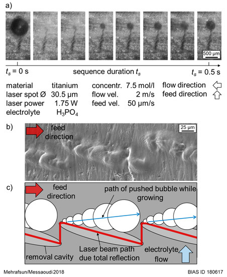 - The occurrence of removal disturbances was caused by adhering gas bubbles. On the one hand, these bubbles inhibited the material dissolution reaction and supported a simultaneous deposition of metallic salts and oxides. Moreover, the gas bubbles influenced the location and amount of laser energy by deflection and total reflection and led to a broadening or a dislocation of the removal area.