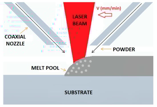 A coaxial nozzle was used for experimental tests. Nitrogen was used as a carrier gas to deliver the powder from the powder feeder to the melt pool and the same gas was used to generate a protective atmosphere during the deposition process. Metallic powder particles were placed in a GTV powder feeder (from GTV Verschleißschutz GmbH Company, Luckenbach, Germany) and delivered to the process zone through a coaxial nozzle. A schematic layout of the used laser cladding system is shown in Figure 1.