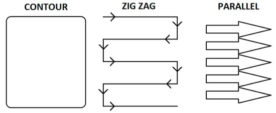 Besides the overlapping percentage, the strategy used for generating layers was also considered as a process parameter for solid forms. Figure 2 shows the sketches of the three types of strategies applied to deposit the powder flow. The first strategy consists on creating a contour of the form, by growing a wall with square form in the first place. The second draws Zig Zag tracks as the coaxial nozzle moves back and forth parallel to the same direction all the time []. Finally, the third one is called Parallel (also known as Raster strategy []): the laser clads are deposited in parallel, starting and finishing at the same point.