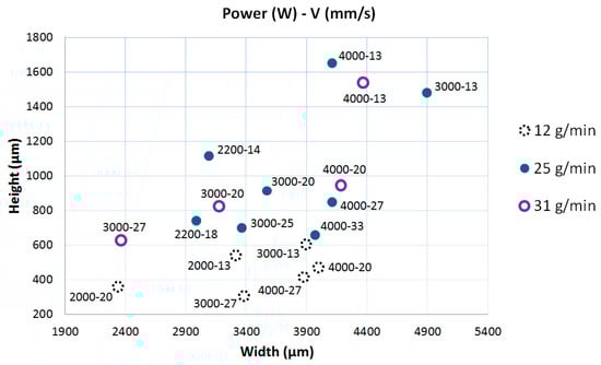 Dimensions of clads (height vs width) with their process parameters inside the graphic (Power (W)-V (mm/s)).