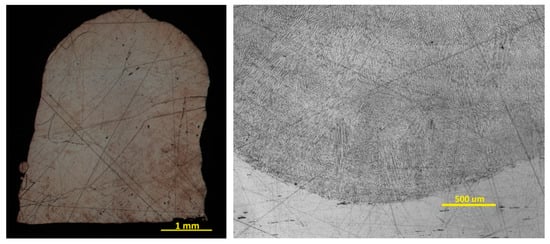 Figure 7 and Figure 8 show two tests that were manufactured following the Zig Zag strategy. The first one was made with a 40% overlap (one layer), while in the second the overlap value was set to 30% (two layers). The main difference that can be seen from both tests is the homogeneity of the resulting surface. In Test 1 it is observed that the delivered powder was piled up, obtaining a rough surface due to the high percentage of overlap, which was the reason for not continuing with the test and depositing a second layer, since it would achieve poor adhesion between layers. Instead, in Test 2 the edges were not very sharp, but the surface was more homogenous than in the former case, because of the lower percentage of overlap used, so that a second layer was grown to verify if good adhesion between the layers would be achieved. Common aspects can be observed in both tests: they are free of porosity and cracking and there is good adhesion between the substrate and the deposited powder.