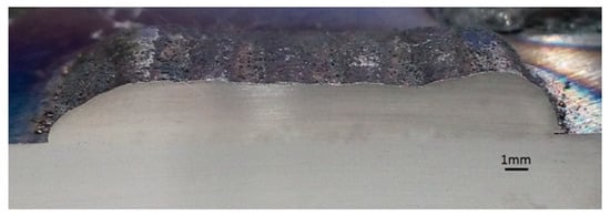 In this direction, for instance, dilution is a very relevant parameter when looking for an appropriate process window. Quantitatively, dilution can be calculated as the ratio of molten substrate to molten material during a LC process. The importance of dilution control lies in the fact that, as a consequence of an extensive fusion of the substrate material, mechanical and corrosion properties of the deposited layer can heavily degraded due to the mixture with the substrate []. In comparison with a higher energetic process such as arc welding, dilution of the melted substrate in LC is lower, but it is, nonetheless, difficult to find the optimum process parameters to guarantee a proper metallurgical bond []. Another disadvantage is that LC is considered a slow process when compared with other additive processes like arc welding [].