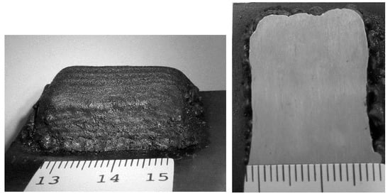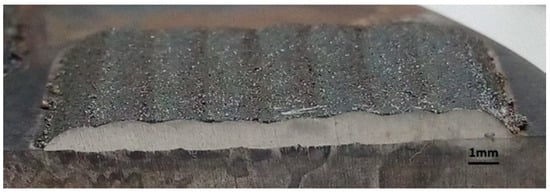 The multiple clad volume generated was built layer by layer following a Parallel strategy with a total of 10 layers, and the result obtained is presented in Figure 10. In this case, the surface was machined to analyze if porosity, cracks or lack of material had appeared, and no defects were found. Actually, it should be mentioned that, sometimes, depending on the final application of the manufactured piece, it is necessary to apply a finish machining operation to the additively manufactured pieces due to the surface quality. Furthermore, the combination of both manufacturing techniques is defined as hybrid manufacturing, which is being developed in the industry [].