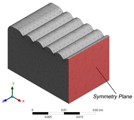 A finite element model of a profiled short rib board with shallow grooves and its symmetry plane.