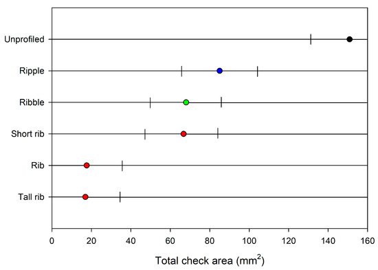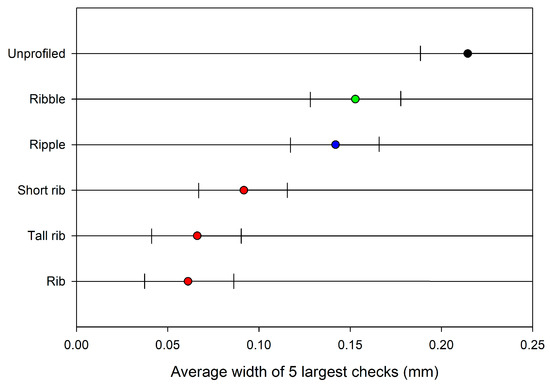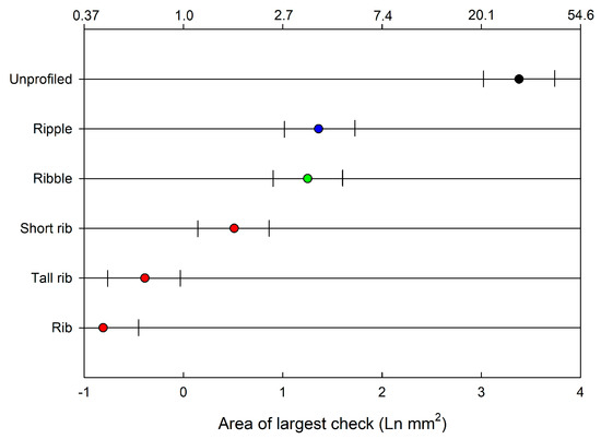 Profiles with narrower grooves (rib profiles), including the short rib profile, were significantly (p < 0.05) more effective than profiles with wider grooves (ribble and ripple profiles) at restricting checks from becoming wider when profiled deckboards were exposed outside for six months (Figure 3). Furthermore, the largest check in profiled samples was significantly (p < 0.001) smaller than those in unprofiled (flat) deckboard samples (Figure 4). There were also significant (p < 0.05) differences in the area of the largest check that developed in the different profiled boards (Figure 4). The largest check in samples with narrow and deep grooves (tall rib and rib) was significantly (p < 0.05) smaller than those in other profiled samples including samples with the short rib profile (Figure 4).
