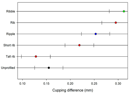 The rib profiles had very narrow grooves and hemispherical peaks (Table 2). The wavy (ribble and ripple) profiles had wider grooves (Table 2). Within the rib profile type there were three grooves depths: 1, 1.5 mm (short rib); 2, 2.0 mm (rib); 3, 2.5 mm (tall rib) (Table 2). The widths of peaks in all samples except the flat controls were 5.0 mm.