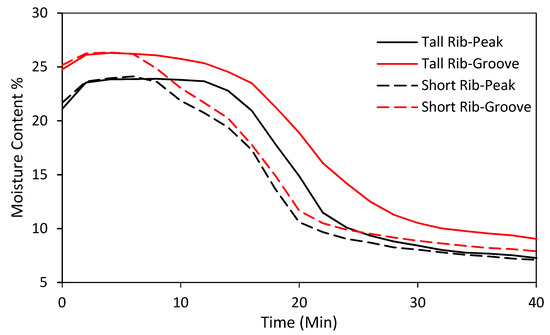 Moisture contents of grooves and peaks in profiled spruce samples with deep (tall rib) or shallow grooves (short rib) during a drying cycle.