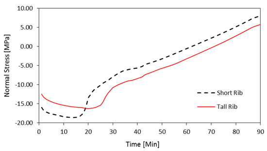 Normal stress in x-direction in the grooves of samples with 2.5 mm deep grooves (tall rib) vs. 1.5 mm deep (short rib) grooves.