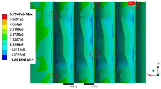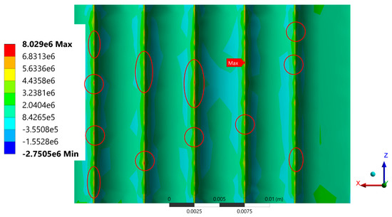 Figure 8 and Figure 9 show the induced normal stresses in x-direction for samples with shallow (short rib) and deep (tall rib) grooves, respectively. It can be observed that in the sample with shallower (1.5 mm deep) grooves the number of areas with high stress is greater than those in a sample with 2.5 mm deep grooves (tall rib profile).