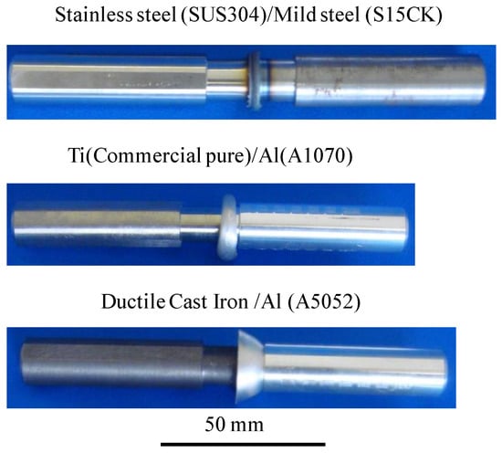 The first set of specimens, defined as SU–SC, was prepared by joining two different materials, namely, stainless steel (JIS: SUS304) and mild steel (JIS: S15CK). The chemical composition (wt%) of the stainless steel was as follows: 0.052 C, 0.416 Si, 1.529 Mn, 0.0319 P, 0.0186 S, 8.057 Ni, 18.293 Cr, 0.185 Mo, 0.483 Cu, and 70.9345 Fe. The chemical composition (wt%) of the mild steel was as follows: 0.15 C, 0.20 Si, 0.40 Mn, 0.19 P, 0.022 S, 0.03 Ni, 0.14 Cr, 0.02 Cu, and 98.848 Fe. The tensile strength (i.e., ultimate strength), elongation, and hardness of the stainless steel were 663 MPa, 55%, and 182 HV, respectively. The tensile strength (i.e., ultimate strength), elongation, and hardness of the Mild Steel were 439 MPa, 38%, and 132 HV, respectively. The second set of specimens, defined as Al–Ti, was prepared by joining two different materials, namely, aluminum (JIS: A1070) and commercial pure (CP) titanium. The chemical composition (wt%) of the aluminum (JIS: A1070) were as follows: 0.03 Si, 0.10 Fe, 0.01 Cu, 0.02 Mg, 0.01 V, 0.01 Ti, others ≤ 0.03 others, and 99.82 Al. The chemical composition (wt%) of the CP titanium was as follows: 0.0011 H, 0.089 O, 0.006 N, 0.038 Fe, 0.005 C, and 99.8609 Ti. The tensile strength (i.e., ultimate strength), elongation, and hardness of the aluminum (JIS: A1070) were 120 MPa, 27%, and 41 HV, respectively. The tensile strength (i.e., ultimate strength), elongation, and hardness of the CP titanium were 401 MPa, 35%, and 146 HV, respectively. The other set of specimens, defined as Al–CI, was prepared by joining two different materials, namely, aluminum (JIS: A5052) and ductile cast iron. The chemical composition (wt%) of the aluminum (JIS: A5052) was as follows: 0.09 Si, 0.16 Fe, 0.02 Cu, 0.03 Mn, 2.6 Mg, 0.25 Cr, 0.01 Zn, ≤0.15 others, and 96.69 Al. The chemical composition (wt%) of the ductile cast iron was as follows: 3.76 C, 2.91 Si, 0.49 P, 0.011 S, 0.029 Mg, and 92.8 Fe. The tensile strength (i.e., ultimate strength), elongation, and hardness of the aluminum (JIS: A5052) were 265 MPa, 17.4%, and 86 HV, respectively. The tensile strength (i.e., ultimate strength), elongation, and hardness of the ductile cast iron were 442 MPa, 18.7%, 79.2 HRB, respectively.