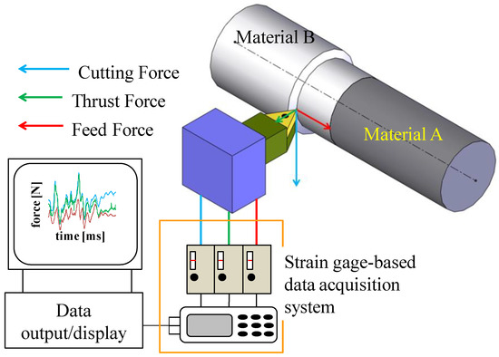 The joint area was machined from both directions—the hard-to-soft material direction and vice versa (i.e., from the Material A to Material B directions, and vice versa)—for each specimen. To do this, the machining force signals for a machining length of about 4 mm were recorded using a strain gage-based data acquisition system, as schematically illustrated in Figure 2. As seen in Figure 2, the system outputs the machining forces from three different channels. One of the channels records the forces in the direction of the cutting speed. The force signals recorded from this channel are called cutting force signals. Another channel records the forces in the direction of the feed. The force signals recorded from this channel are called feed force signals. The other channel records the forces in the direction of the tool post. The force signals recorded from this channel are called thrust force signals. The signals were recorded after every 0.2 ms for the three channels. It is worth mentioning that the cutting and feed force signals were used to calculate the cutting power and thereby to determine the specific cutting energy/pressure. The thrust force signals were not used in the calculations but recorded for the sake of having a complete picture of the machining phenomena.