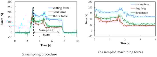 However, for the sake of analysis, the raw signals require sampling. Figure 3 schematically illustrates the sampling technique. The description is as follows. The time series of the force signals consists of the signals produced when the cutting tool approaches the cutting zone, when the cutting tool is removing materials, and when the cutting tool moves away from the cutting zone. Therefore, the raw signals, as shown in Figure 3a, require sampling. To do the sampling, a sampling span, i.e., a time interval, was chosen in such a way that the signals in the sampling span consist of cutting/feed/thrust force signals only when the cutting tool removes the materials either in the constituent material zone (i.e., in the zone of Material A and Material B) or in the joint area (i.e., the segment where Material A and B are physically connected). The case shown in Figure 3 corresponds to the sampling of the machining force signals in the joint area. The force signals after sampling were reset to a time equal to zero. Thus, the following relationships hold between the raw and sampled signals.