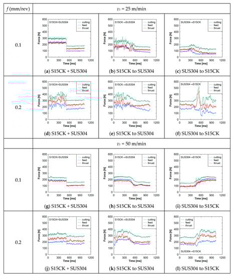 Figure 4 shows the machining forces (thrust, feed, and cutting forces) in the time domain. The plots in Figure 4a,d,g,j show the expected machining forces of the constituent materials (S15CK + SUS304), neglecting the joint area. The plots in Figure 4b,e,h,k show the machining forces manifested in the joint area while machining from the S15CK direction to the SUS304 direction. The plots in Figure 4c,f,i,l show the machining forces manifested in the joint area while machining from the SUS304 direction to the S15CK direction. As seen in Figure 4, if a low feed (0.1 mm/rev) and low cutting speed (25 m/min) are used and machining is done from the hard material (SUS304) direction to the soft material (S15CK) direction, then the machining forces can be reduced. When a high feed is preferred, then the choice is to machine from the opposite direction—from the soft material (S15CK) direction to the hard material (SUS304) direction. For a high cutting speed (50 m/min), this argument is still valid for both low and high feeds, but a low feed is perhaps a better option.