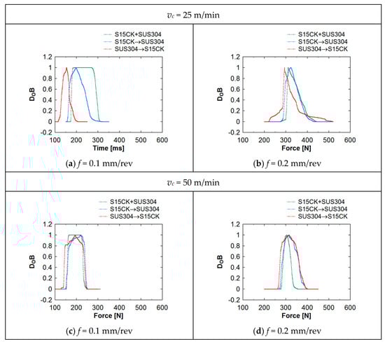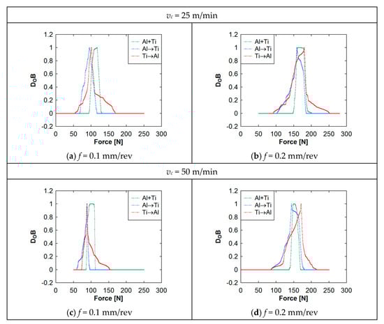 To be more specific, the uncertainty in the cutting forces was studied by constructing the possibility distributions [25,26] (probability-distribution-neutral representation of uncertainty) for the cutting forces, as shown in Figure 4. Appendix B shows the mathematical settings for inducing a possibility distribution from a set of numerical data. The results are shown in Figure 5. In the plots in Figure 5, the phrase “DoB” means the degree of belief (or membership value, see Appendix B), which is a value in the interval [0, 1]. The possibility distributions also support the abovementioned conclusions regarding the relationships between cutting conditions and cutting forces. In particular, the possibility distributions show that the use of a low feed and low cutting speed and the cutting direction hard-to-soft is a better option for reducing the cutting force and its uncertainty.