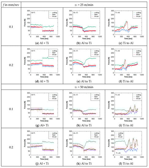 Figure 6 shows the machining forces (thrust, feed, and cutting forces) in the time domain for the dissimilar metallic specimens denoted as Al–Ti for the cutting conditions listed in Table 1. The plots in Figure 6a,d,g,j show the expected machining forces of the constituent materials (Al + Ti), neglecting the joint area. The plots in Figure 6b,e,h,k show the machining forces manifested in the joint area while machining from the Al direction to the Ti direction. The plots in Figure 6c,f,i,l show the machining forces manifested in the joint area while machining from the Ti direction to the Al direction. As seen in Figure 6, if a low feed (0.1 mm/rev) and low cutting speed (25 m/min) are used and the machining is done from the soft material (Al) direction to the hard material (Ti) direction, then the machining forces can be reduced. The same conclusion regarding the feed is valid for a high cutting speed. This is somewhat an opposing conclusion compared to that of the previous case. The reason for this somewhat dissimilar result is perhaps the hardness of the materials. Here, Al is too soft compared to the other material. This means that when a very soft metal is used in a dissimilar metallic object, it is better to start the machining operation from the soft material side using a low feed and low cutting speed.
