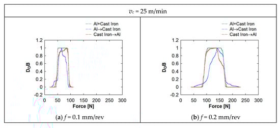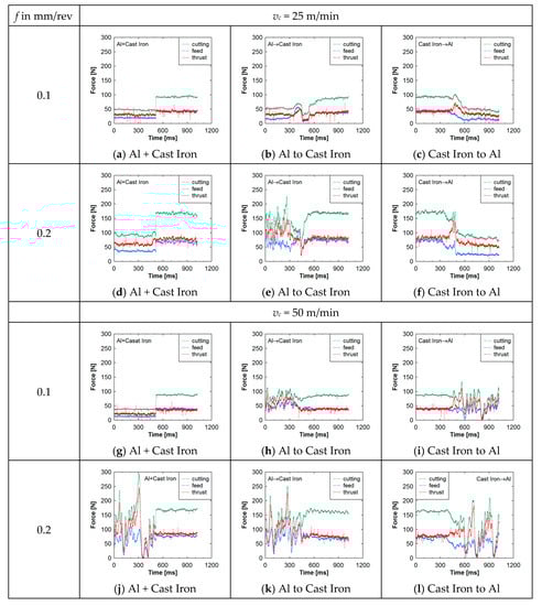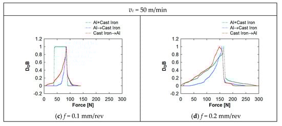 This section describes the machining forces underlying the bimetallic specimens denoted as Al–CI. It is worth mentioning that this is a uniform combination similar to the previous two cases, because the tensile strength, hardness, and percent elongation of cast iron are greater than those of aluminum (A5052), as listed in Table 1 (note that the hardness equal to 79.2 HRB is about 142 HV.) Compared to the previous case, the Al alloy used here is much harder. As such, it will help validate the conclusions made in the previous two sections.