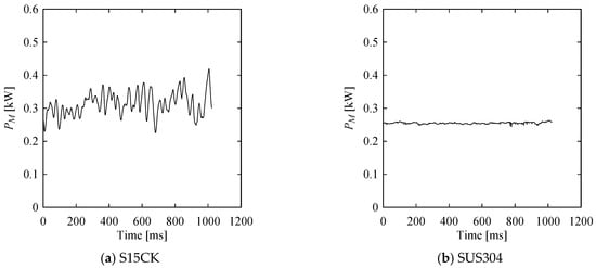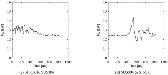 Figure 10 shows, for example, the PM of the bimetallic specimen called SU–SC for the cutting conditions vc = 25 m/min and f = 0.2 mm/rev. As seen in Figure 10, PM varies in the range of [0.2, 0.45] kW. The variability in the cutting power for the four possibilities are illustrated in Figure 10a–d that correspond to the segments S15CK, SUS304, S15CK to SUS304, and SUS304 to S15CK, respectively. When the cutting tool passes the joint area, a gradual decrease/increase in the cutting power is observed, which is similar to that of the machining forces. This means that when the force sensors are not available, a power measurement instrument can be used to monitor the machining behavior of a bimetallic object.