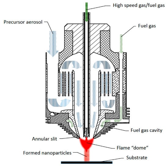 However, the mechanism of how nanoparticles are formed and deposited is not generally defined. Since the process has a number of parameters with various precursors and reactor designs, several researchers [15,16,17] admitted that the method is not clearly generalized. Pratsinis [16] mentioned that bulk material properties change on the nanoscale because the principle of continuum does not fit to nanoparticles, and therefore the process was verified by experimental results and simulations.