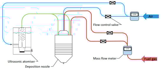 The structure of a dual velocity deposition nozzle is described in [33], and a port for fuel gas input was added to the literature’s nozzle design (Figure 1) so that it can be used for flame spray pyrolysis.