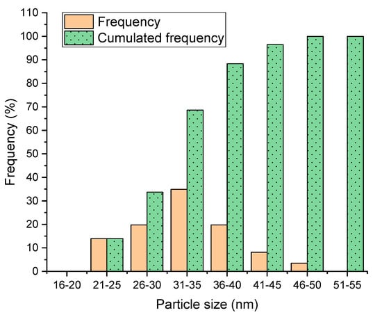 Figure 4 illustrates the size distribution of the nanoparticles, which shows similar tendency to the other experiments. It is known that the size of nanoparticles is mostly governed by size of the precursor droplets by the atomizer. Since the size of droplets at the exit of the atomizer varies from 3 µm to 10 µm at 2.4 MHz resonant frequency of the atomizer, the nanoparticle size distribution can be more concentrated when the sizes of the precursor droplets are regularly distributed.