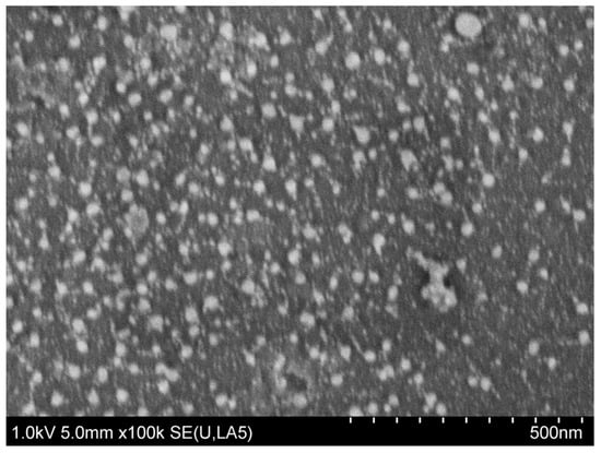 Experiments were performed to verify the system’s capability to deposit nanoparticles on a substrate. To prepare a precursor solution, 250 mg of silver nitrate (250 mg, AgNO3 > 99%, Sigma Aldrich, St. Louis, MO, USA) was dissolved into 250 mL of deionized water, and the solution was mixed by magnetic stirring for 25 min. According to the literature [34], silver nitrate begins to decompose at 450 °C, and finishes at 520 °C with 63.5% of the mass remained while the residual component is silver. Because AgNO3 reacts to light and produces silver ions, the precursor solution was prepared under low light conditions and the system components were covered with aluminum foil. As for the substrate, an ultra-high vacuum and contamination free aluminum foil (All–Foils Inc. Strongsville, OH, USA) was pasted on an aluminum stub and glued with conductive graphite paste (PELCO Conductive Graphite, Isopropanol base, Ted Pella Inc. Redding, CA, USA). The surface was pre-treated with a corona treater (BD-20, Electro-technics, Chicago, IL, USA) before the deposition to increase the surface energy, thereby stimulating the bonding and adhesion of the surface. The coating was processed with 1.83 m/min feed rate at 22 mm distance between the nozzle tip and the substrate. The nozzle’s trajectory was a zigzag style on the surface area of about 6.45 cm2.