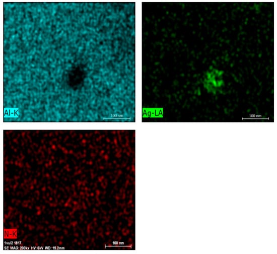 Next, EDX (Energy Dispersive X-ray) analysis was performed using Bruker Quantex EDS system at 6 kV to investigate the spectrum of bright spots in the SEM images. The voltage was set to maximize the L-line emissions for silver. Having 2.983 kV potential and twice the amount of accelerating voltage maximizes emissions, which results in better imaging quality. The spectrum maps of sample #3 at 200,000× magnification in Figure 7 verify that the content of the nanoparticles is silver. In the EDX analysis, aluminum and nitrogen contents were also detected. Aluminum is from the substrate, but nitrogen content can be explained by some droplets reaching the substrate without thermal decomposition and then drying on the surface. Figure 7 verifies that the clump of silver in the picture is not silver nitrate, since the clump is not visible in the picture of nitrogen. However, further measurements and analysis are needed to test for substances other than sliver, such as silver oxide (Ag2O).